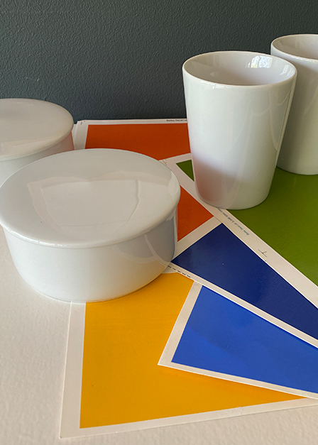 Her får du mulighed for at klippe farver og mønstre ud og overføre det til porcelænsemner. Det kaldes ”transfer” og er simpelt at udføre i vore dage.