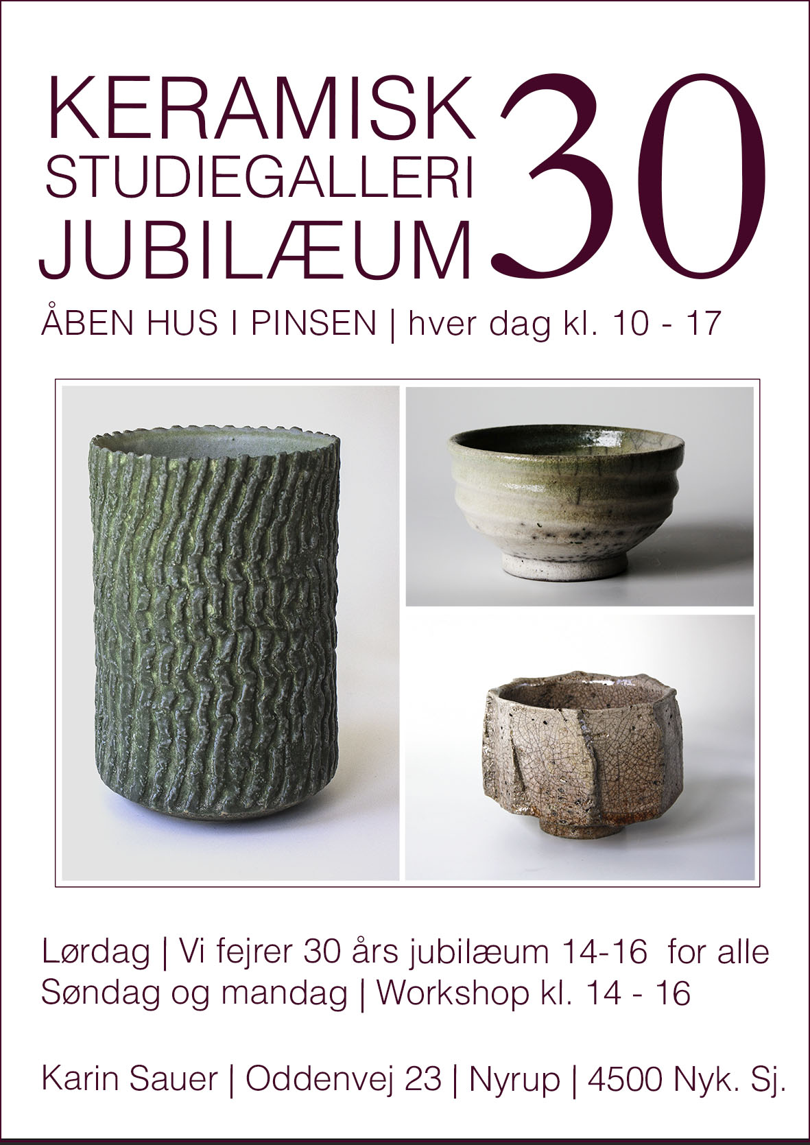 I år er det 30 år siden jeg åbnede galleriet. I den anledning byder jeg alle velkommen til et glas vin eller en kop kaffe med kage lørdag kl. 14 - 16. Jeg håber at se et hav af mennesker, der vil fejre dagen med mig og gøre den festlig.